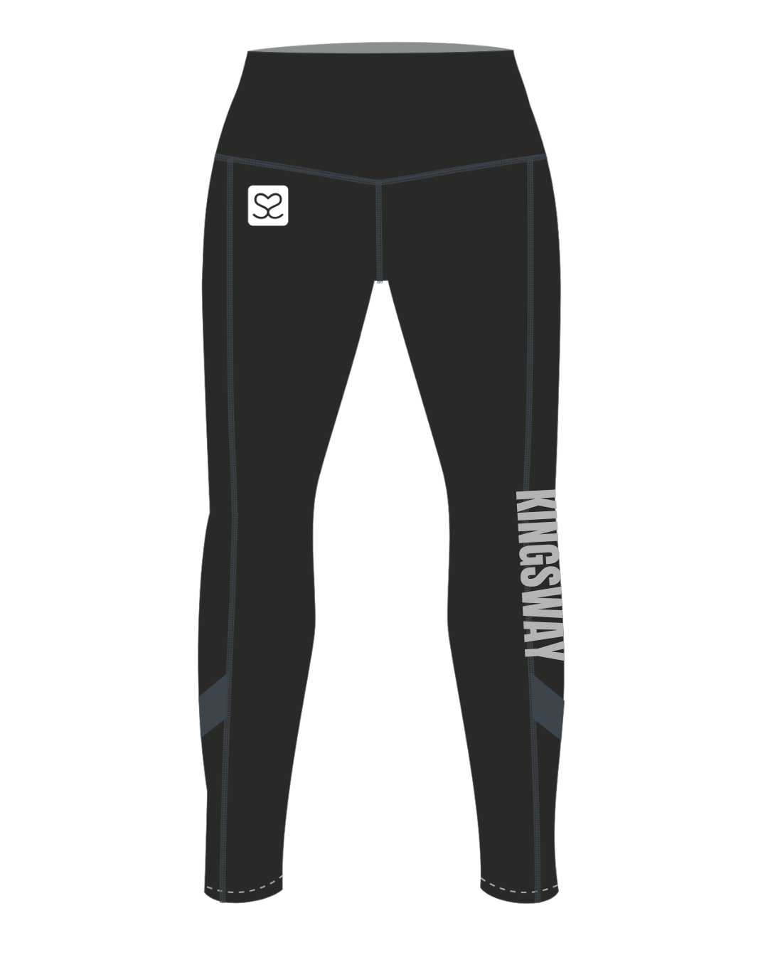This Kingsway Power Netball Club Performance Legging is printed with the Kingsway down the leg in silver.